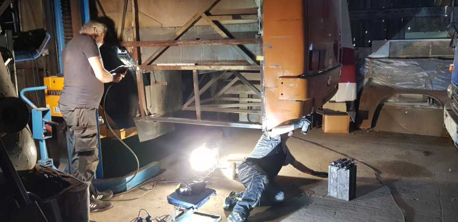 An unseren Vier-Türigen Schlenki haben wir nun die notwendigen Schweißarbeiten an der Fahrerseite beendet. Derzeit sind wir dabei den Radkasten an der C-Achse rechts instand zu setzen. Am Nachläufer sind auf der Einstiegsseite bereits alle defekten Holme ausgetauscht worden. Nach den Arbeiten am Radkasten der C-Achse rechts werden wir im nächsten Jahr die Schweißarbeiten am Triebwagen auf der Einstiegsseite fortsetzen.